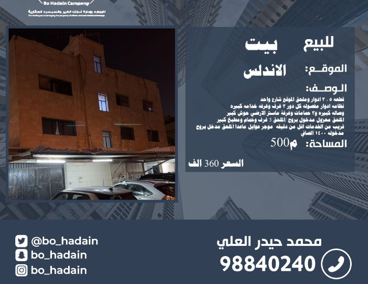 للبيع بناية المهبولة موقع شارع واحد مقابلها ساحة مساحة 500 متر 24 شق..