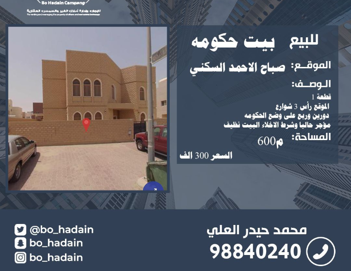 للبيع بيت حكومة في صباح الاحمد السكني ٠ ...