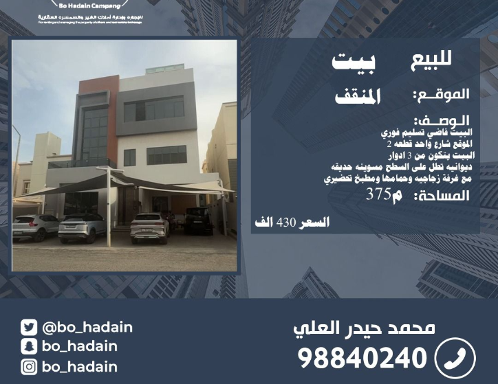 للبيع فيلا في المنقف ق2 المساحة 375 متر...