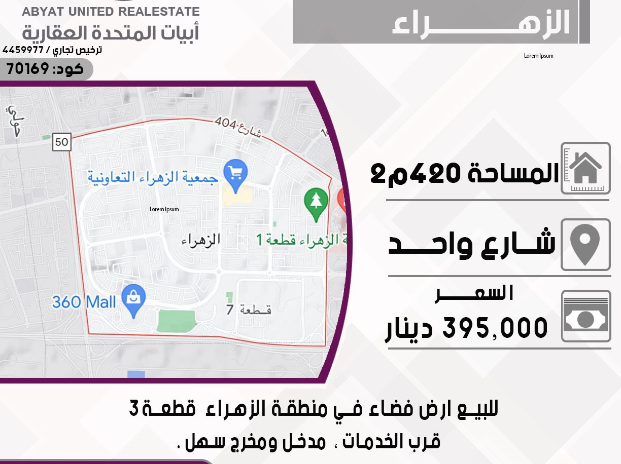 للبيع أرض فضاء في منطقة الزهراء قطعة 3 ، المساحة 420م٢ ، الموقع : شار..