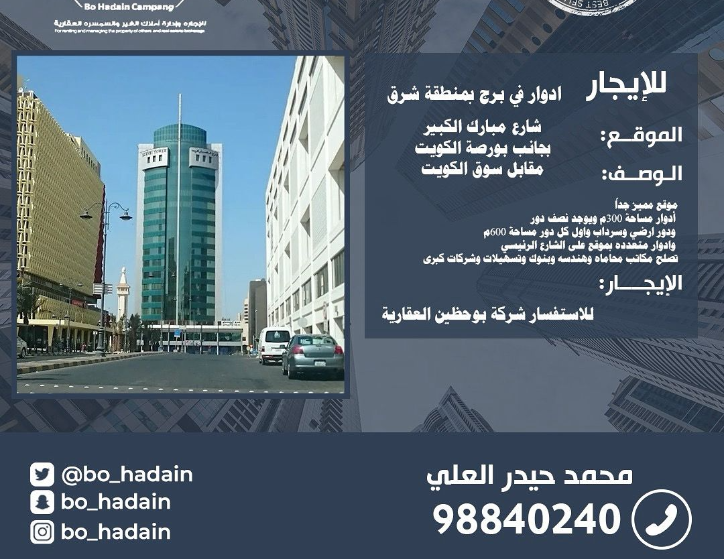 للإيجار ادوار بمنطقة شرق - شارع مبارك الكبير بجانب بورصة الكويت مق..