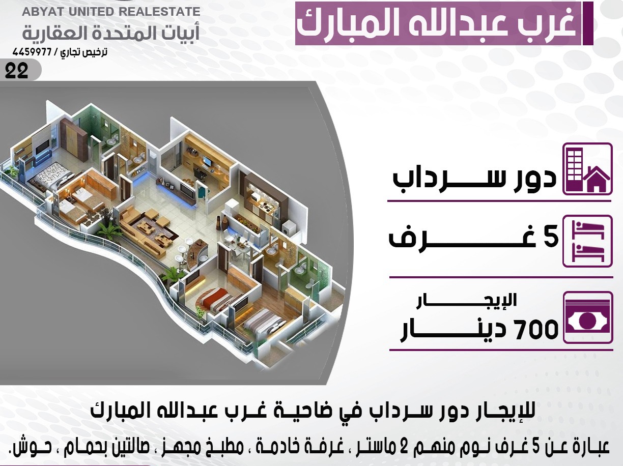 للايجار دور سرداب في ضاحية غرب عبدالله المبارك ، عبارة عن 5 غرف نوم..