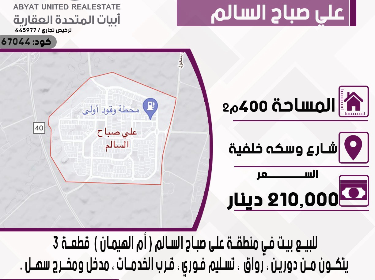 للبيع بيت في منطقة علي صباح السالم قطعة 3 ، المساحة 400م٢ ، الموقع : ش..