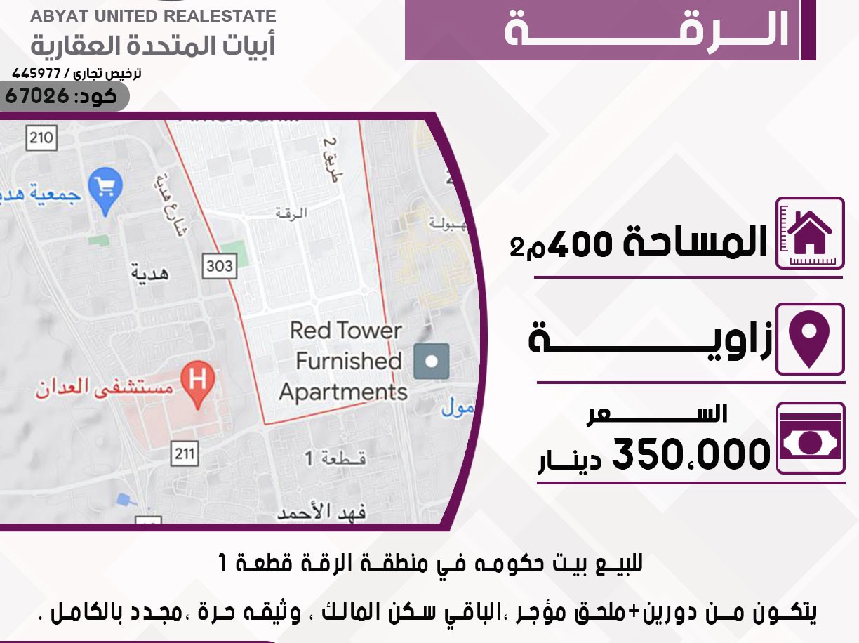 للبيع بيت حكومة في منطقة الرقة قطعة 1 ، المساحة 400م٢ ، الموقع : زاوي..