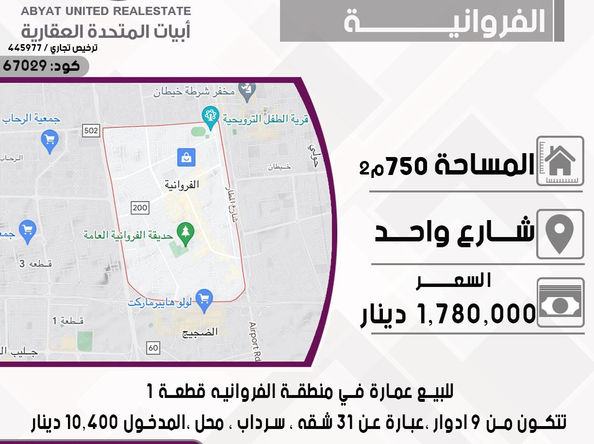 للبيع عمارة في منطقة الفروانية قطعة 1 ، المساحة 750م٢ ، الموقع : شارع..