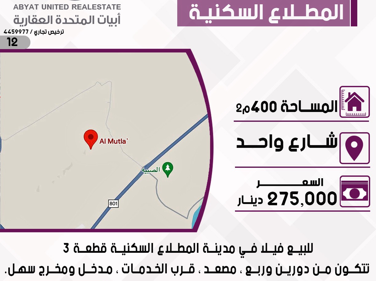 للبيع فيلا في مدينة المطلاع السكنية قطعة 3 ، المساحة 400م2 ، الموقع..