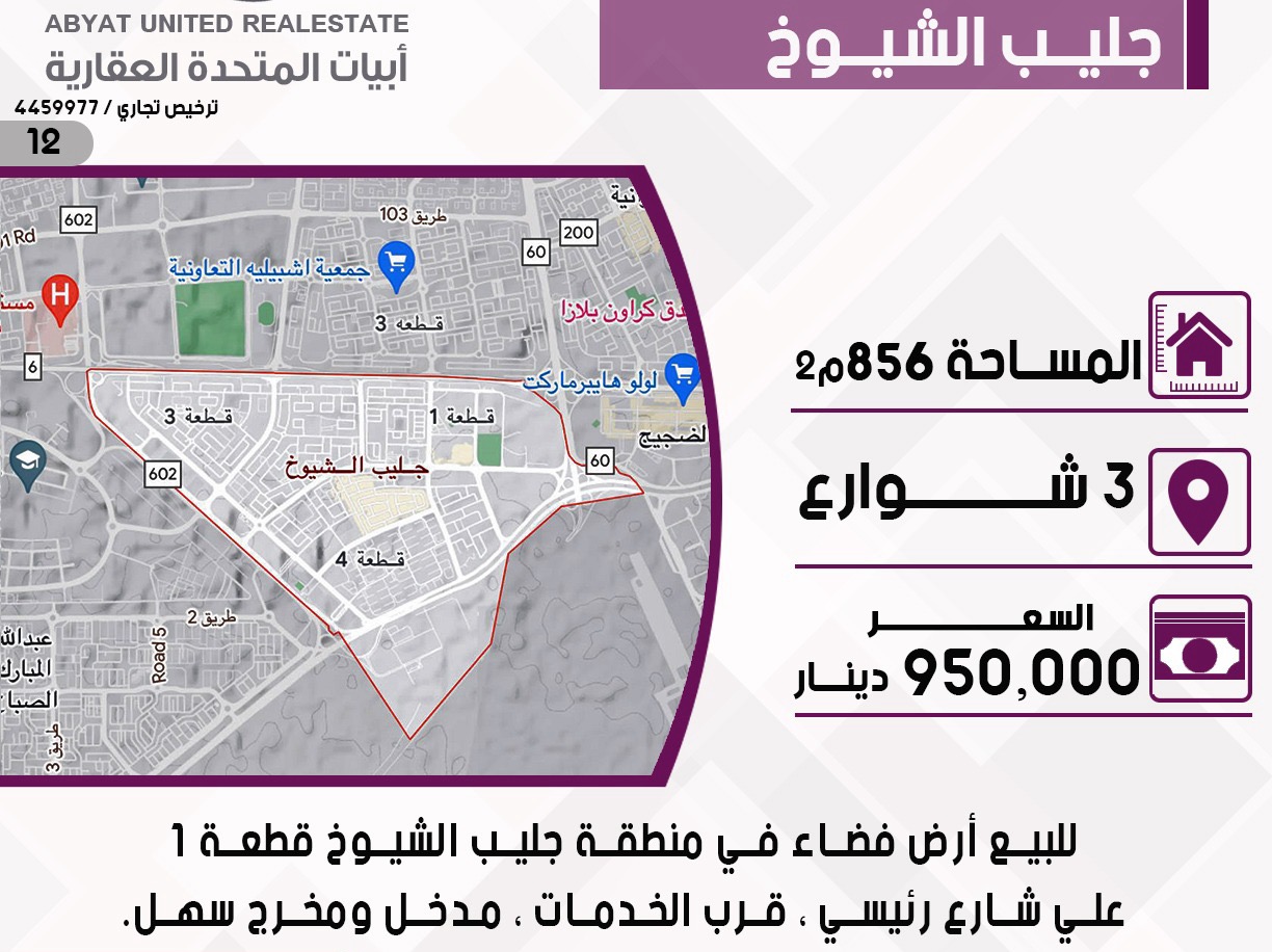 للبيع أرض فضاء في منطقة جليب الشيوخ قطعة 1 ، المساحة 856م2 ، الموقع: 3 ..