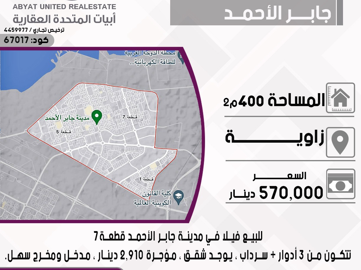 للبيع فيلا في مدينة جابر الاحمد قطعة 7 , الموقع : زاوية ، المساحة 400م..