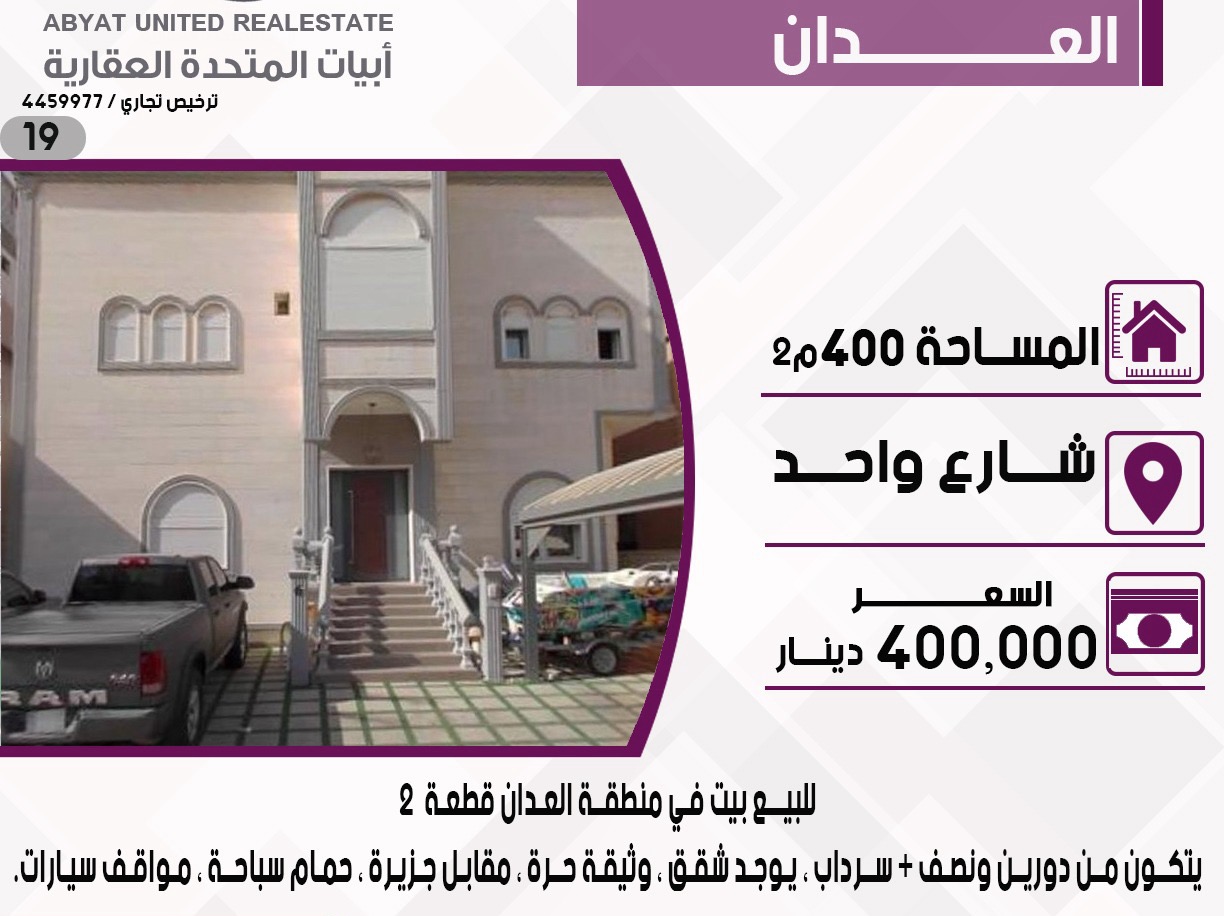 للبيع بيت في منطقة العدان قطعة 2 ، المساحة 400م2 ، الموقع: شارع واحد ،..