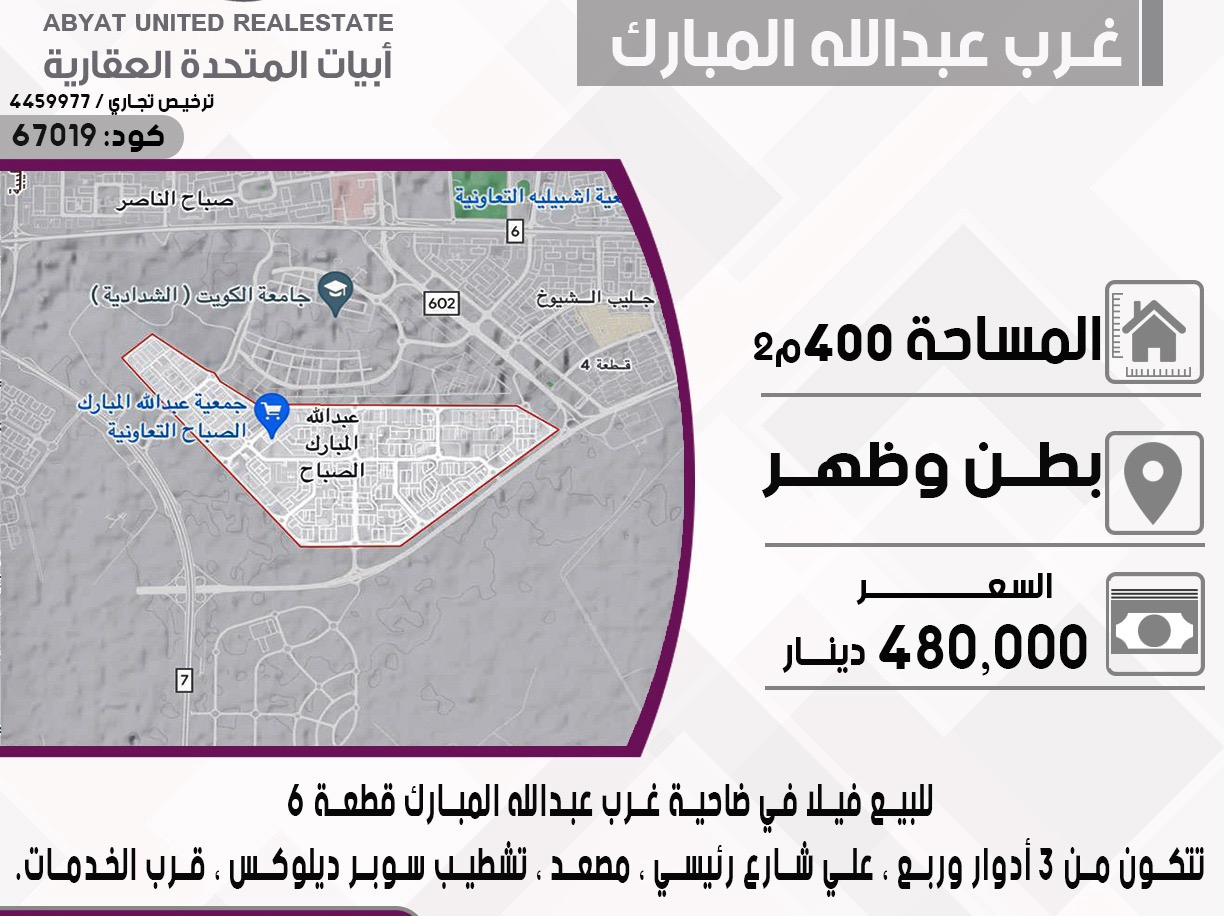للبيع فيلا في ضاحية غرب عبدالله المبارك قطعة 6 , الموقع : بطن وظهر ،..